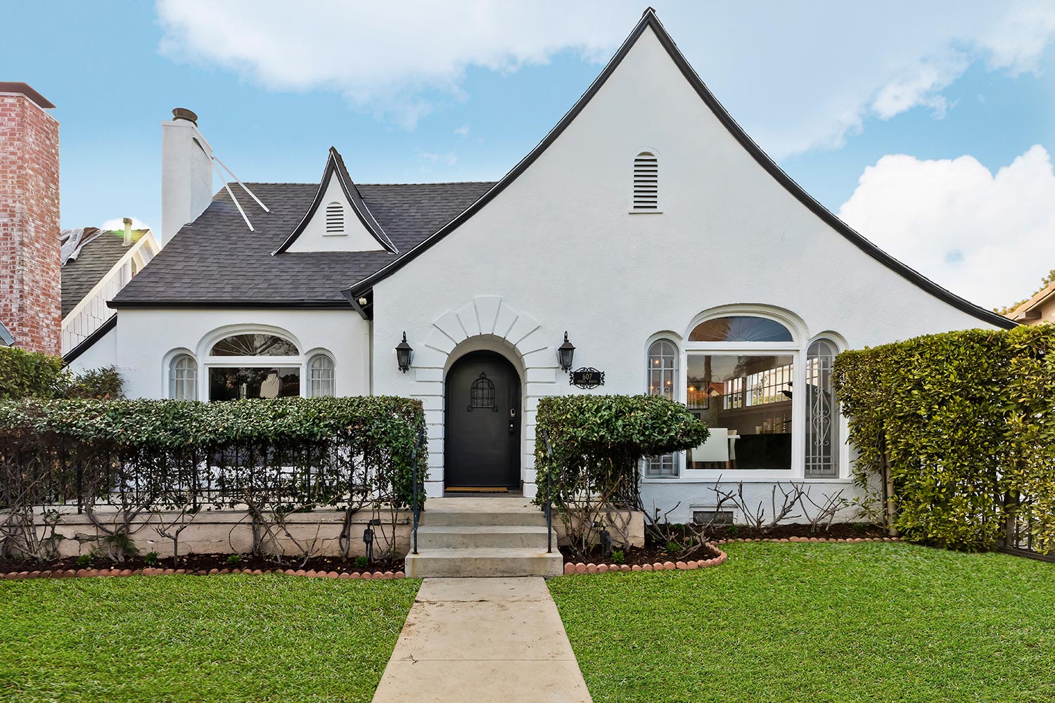 Hedged and gated for complete privacy, this enchanting Country English Traditional blends updated amenities with vintage elements. The elegant living and dining room features soaring barrel ceilings, picturesque floor to ceiling leaded glass windows and patio, classic archways The cheerful kitchen is light and bright with vintage Wedgewood Stove, Caesar stone countertops, breakfast nook and french door that opens to a side patio. There are french doors that lead out from main en suite bedroom and 3nd bedroom/den to covered patio and yard with plenty of room for a pool . The large garage can be converted to an amazing space perfect for home office, gym or guest house. New sewer line and roof. Close to Melrose cafes, shops and coffee shops and the Grove.