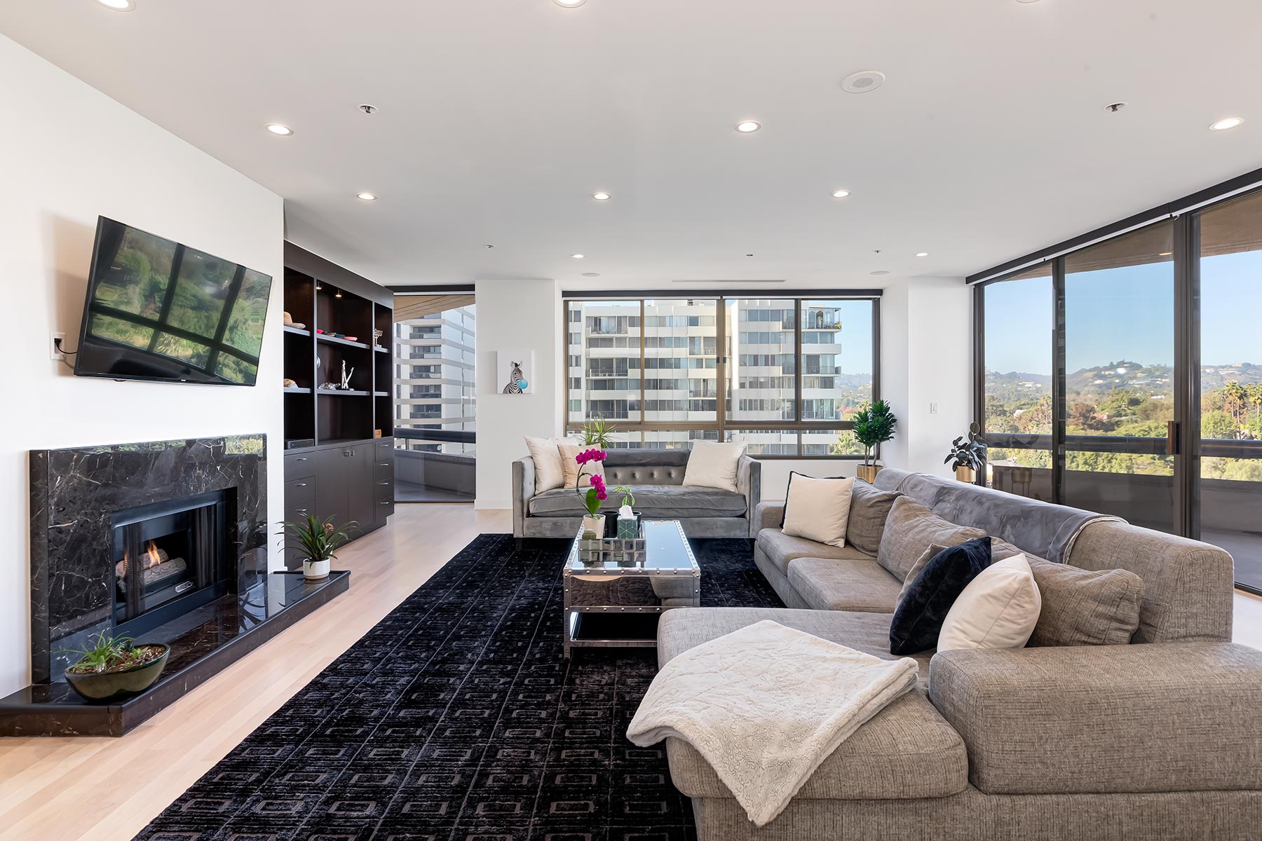 If you've seen this unit before, you won't recognize it now. Recently and tastefully redone spaces filled with natural light featuring gorgeous wood floors, high ceilings, remodeled kitchen/baths, and the obligatory striking views of the hillsides, greenery, city lights, and the iconic Wilshire Corridor. Fantastic open floor plan for entertaining. Great room with large living and dining areas including a fireplace and wet bar opens to the main view balcony. Separate beautiful new powder room. True cook's kitchen with top stainless appliances and quaint breakfast area flowing to a second view balcony. Massive primary suite with a large sitting/office area opens to the second view balcony. The suite also exhibits an exquisitely redone modern bathroom and large walk-in closet. Sizable guest bedroom suite on the opposite side of the unit also has a redone bathroom, views, and main balcony access. The architecturally significant full-service Mirabella complex is located in the premiere eastern section of the Wilshire Corridor and proximate to the best of Beverly Hills, Century City, and the Westside. Amenities include EV charging stations, 24 hour valet, concierge, fitness center, pool, spa, extra storage, EQ Insurance, and a fabulous multipurpose facility with kitchen. Recently renovated hallways and elevators, one of the prettiest lobbies/foyers on the Corridor, and easy ingress/egress from Holmby Ave south of Wilshire Blvd add to the already strong appeal of the Mirabella.