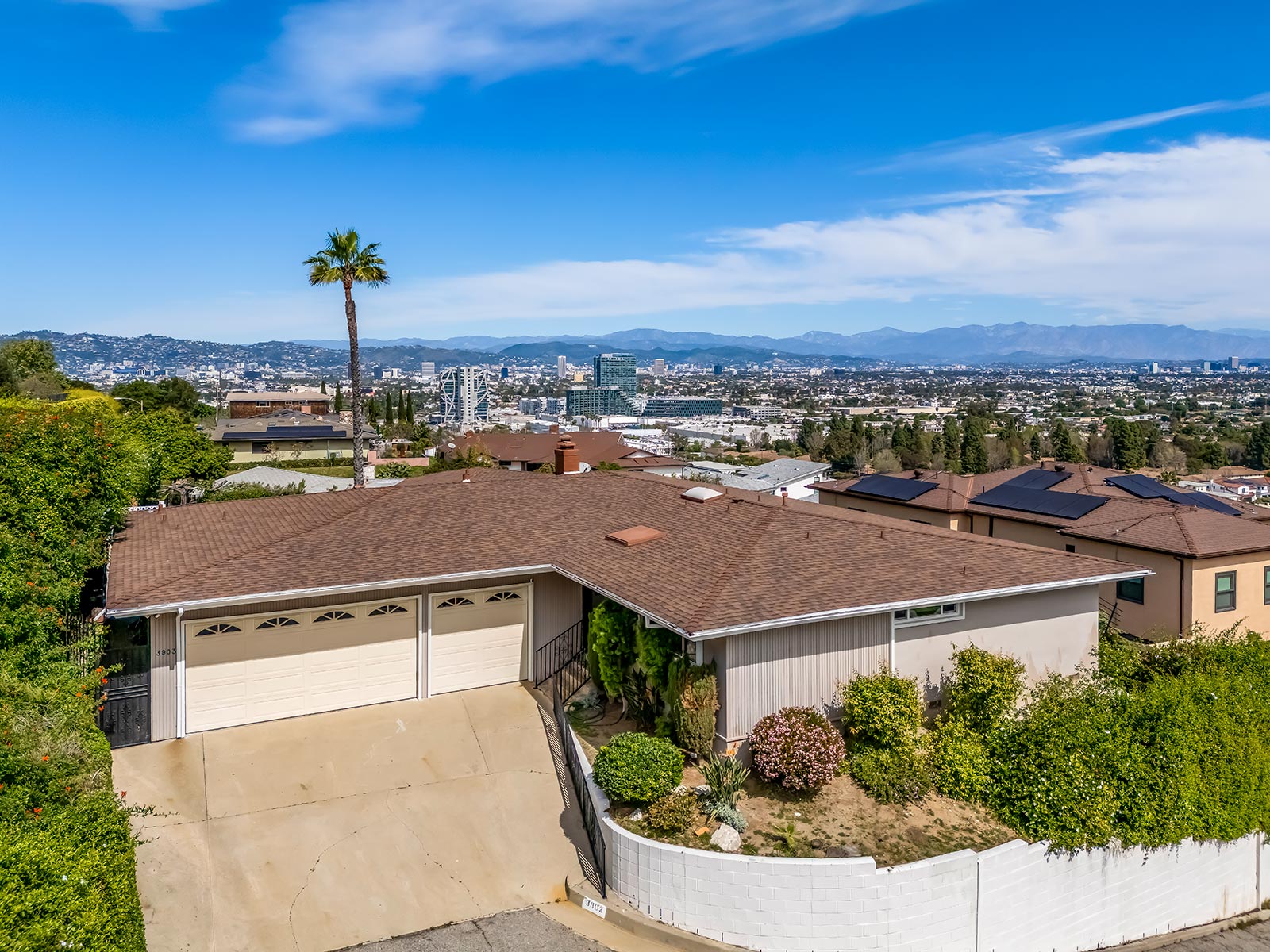 Incredible Mid-Century Modern retreat in the coveted Culver City Hills showcasing sweeping jetliner views across Los Angeles. Built in 1961, this architectural gem captures the essence of classic California living with iconic design elements including a statement cocktail bar, dramatic oversized stone fireplaces, and walls of floor-to-ceiling glass that frame panoramic vistas stretching from the Hollywood Sign to Downtown LA. A striking solitary palm tree silhouettes the sparkling pool and lounge deck, creating a true resort-style setting. The spacious, thoughtfully designed floor plan features a private primary suite complete with a walk-in closet, dedicated vanity area, dual-sink bath, and breathtaking city views from the bedroom. Formal dining flows seamlessly into a grand living room anchored by a stunning stone fireplace and sliding glass doors that open to the pool deck for effortless indoor-outdoor living. A sunken family room wrapped in rich wood paneling offers a second stone fireplace and expansive picture windows — the perfect space to unwind while taking in golden hour over the city skyline. Tucked away on a quiet cul-de-sac in desirable Blair Hills, the home offers access to Farragut Elementary and sits just moments from Baldwin Scenic Overlook Park, scenic trails to Stoneview Nature Center, and the Kenneth Hahn bridge. A dream location for outdoor enthusiasts, yet only minutes from the shops and dining of Downtown Culver City. A rare three-car garage provides excellent potential for a home studio, gym, expanded living space, or future ADU conversion.